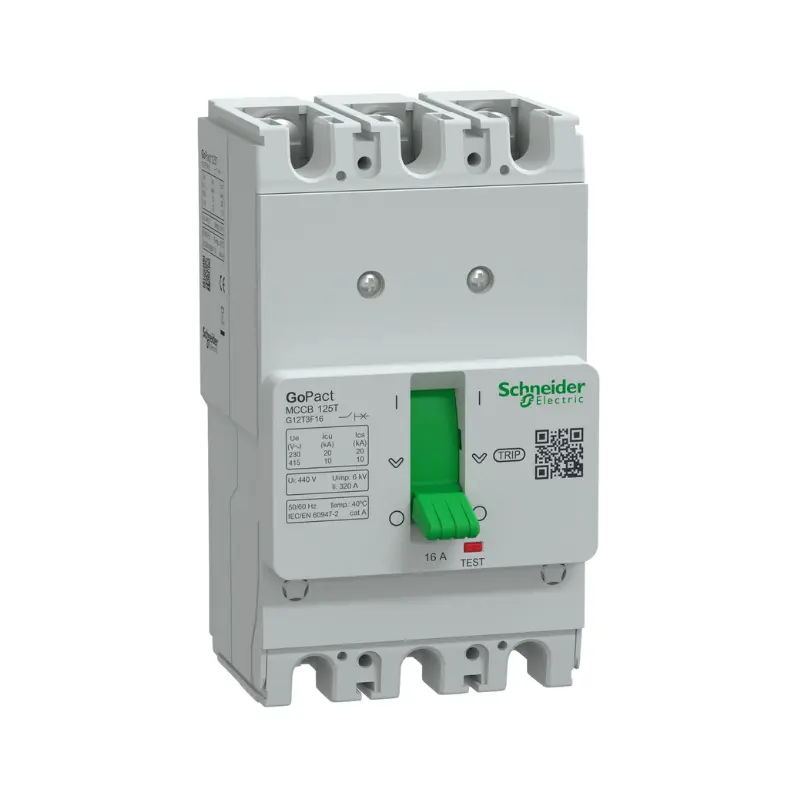 شنايدر G12T3F16، قاطع كهرباء، مفتاح ثلاثي القطب، 16 أمبير، 10 كيلو أمبير عند 415 فولت تيار متردد MCCB GoPact 125، وحدة فصل TMD، حماية حرارية ثابتة